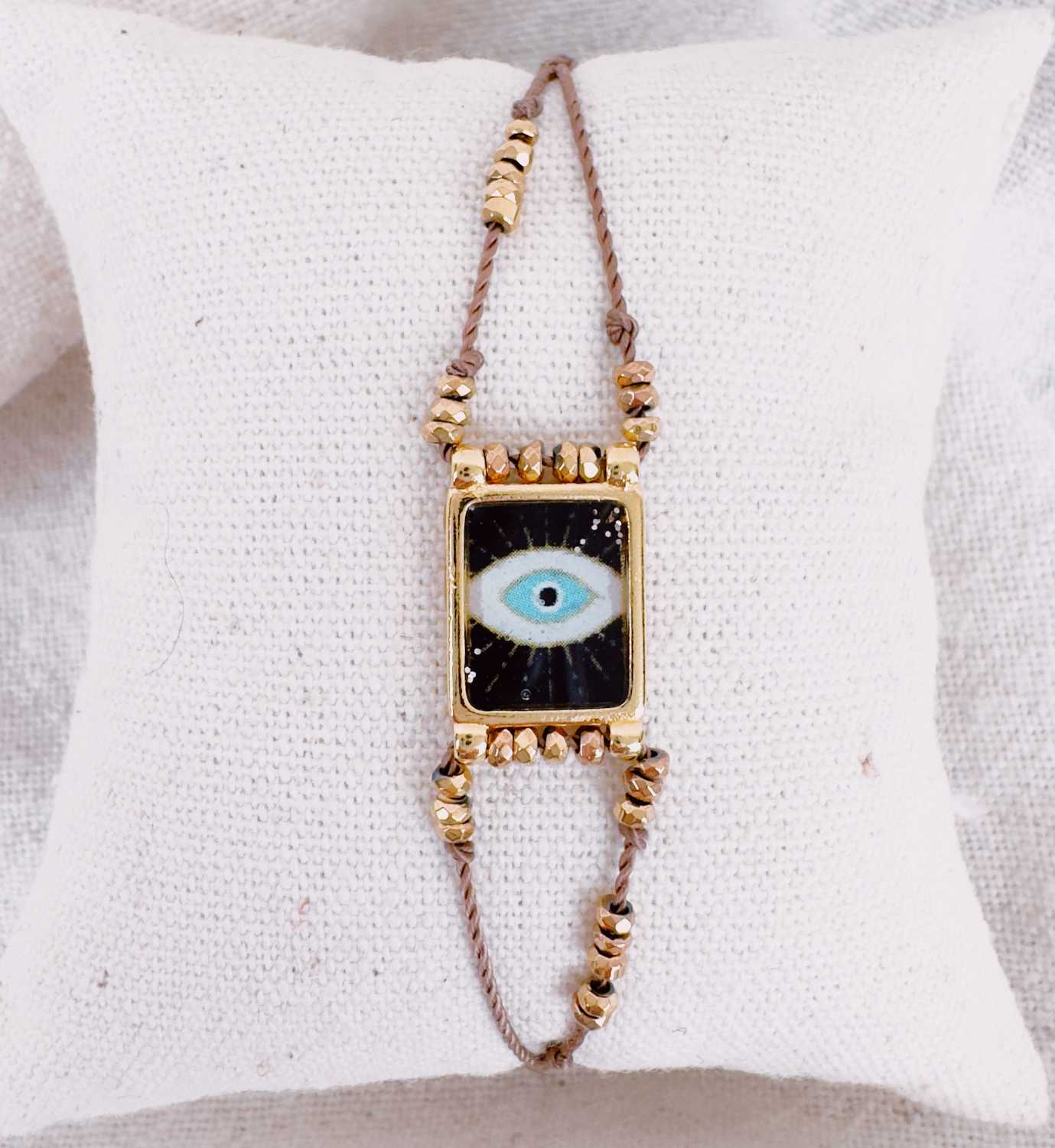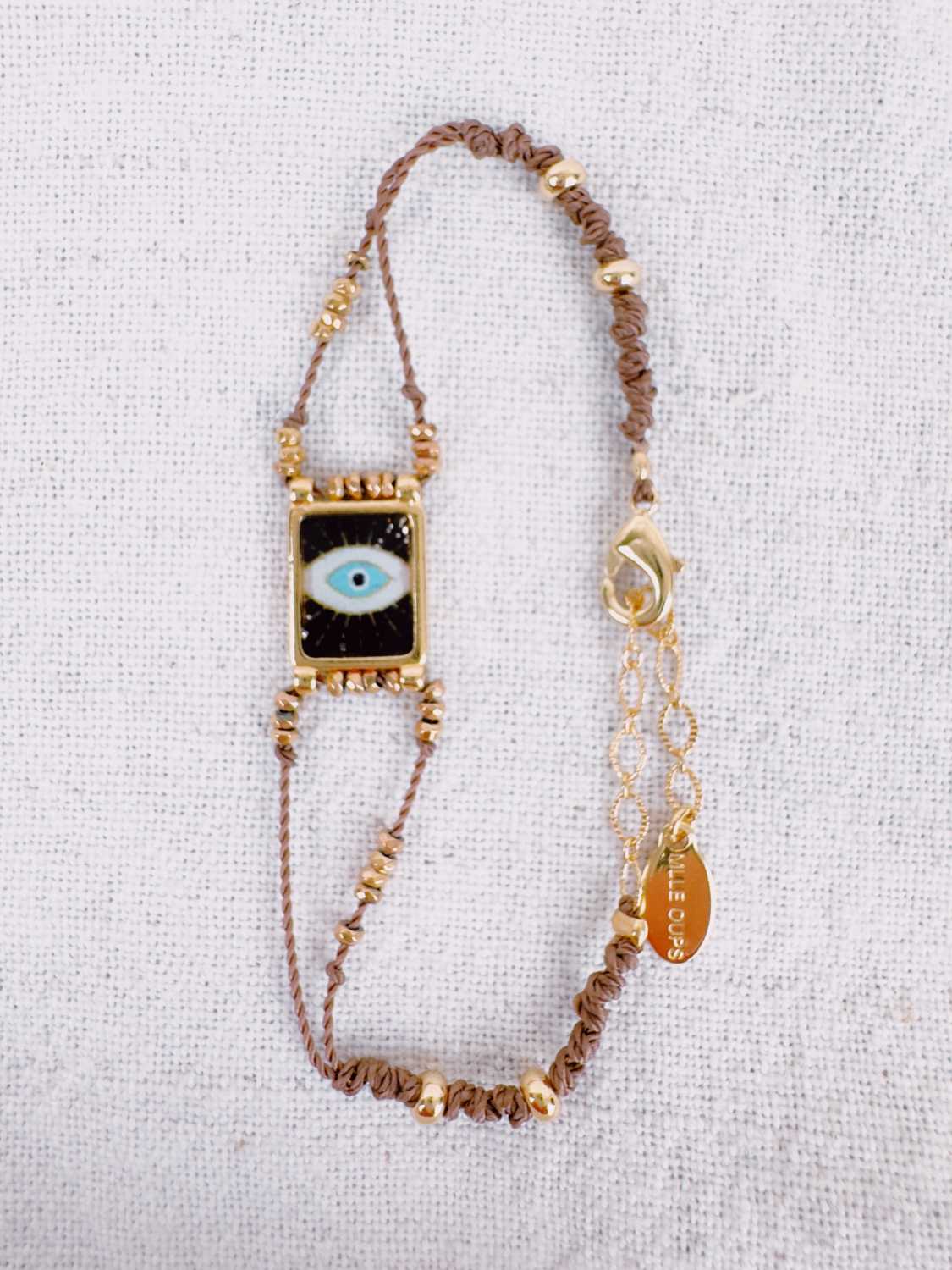 Bracelet avec petite médaille rectangulaire sur cordon tissé à la main et parsemé de petites hématites dorées.