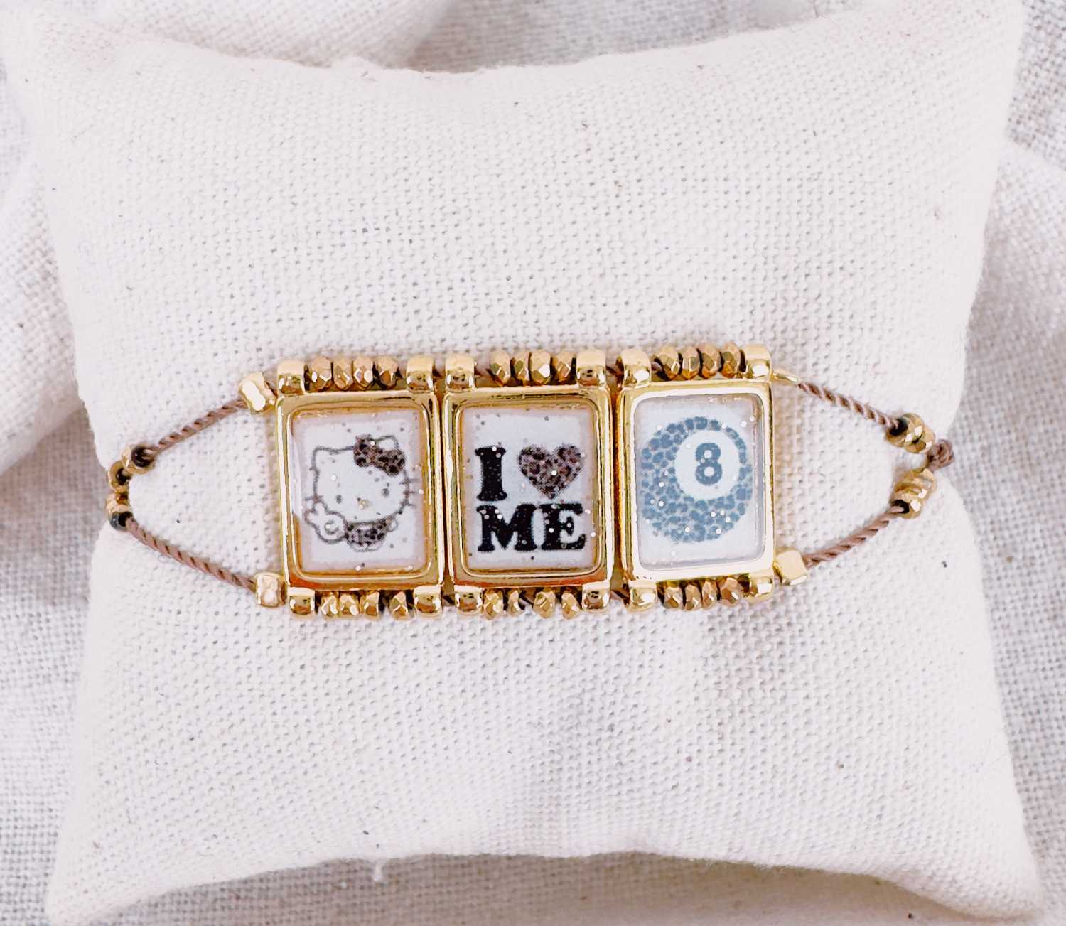 Bracelet composé de 3 petites médailles rectangulaires sur cordon tissé à la main et parsemé de petites hématites dorées. Longueur 14cm + 4cm de rallonge