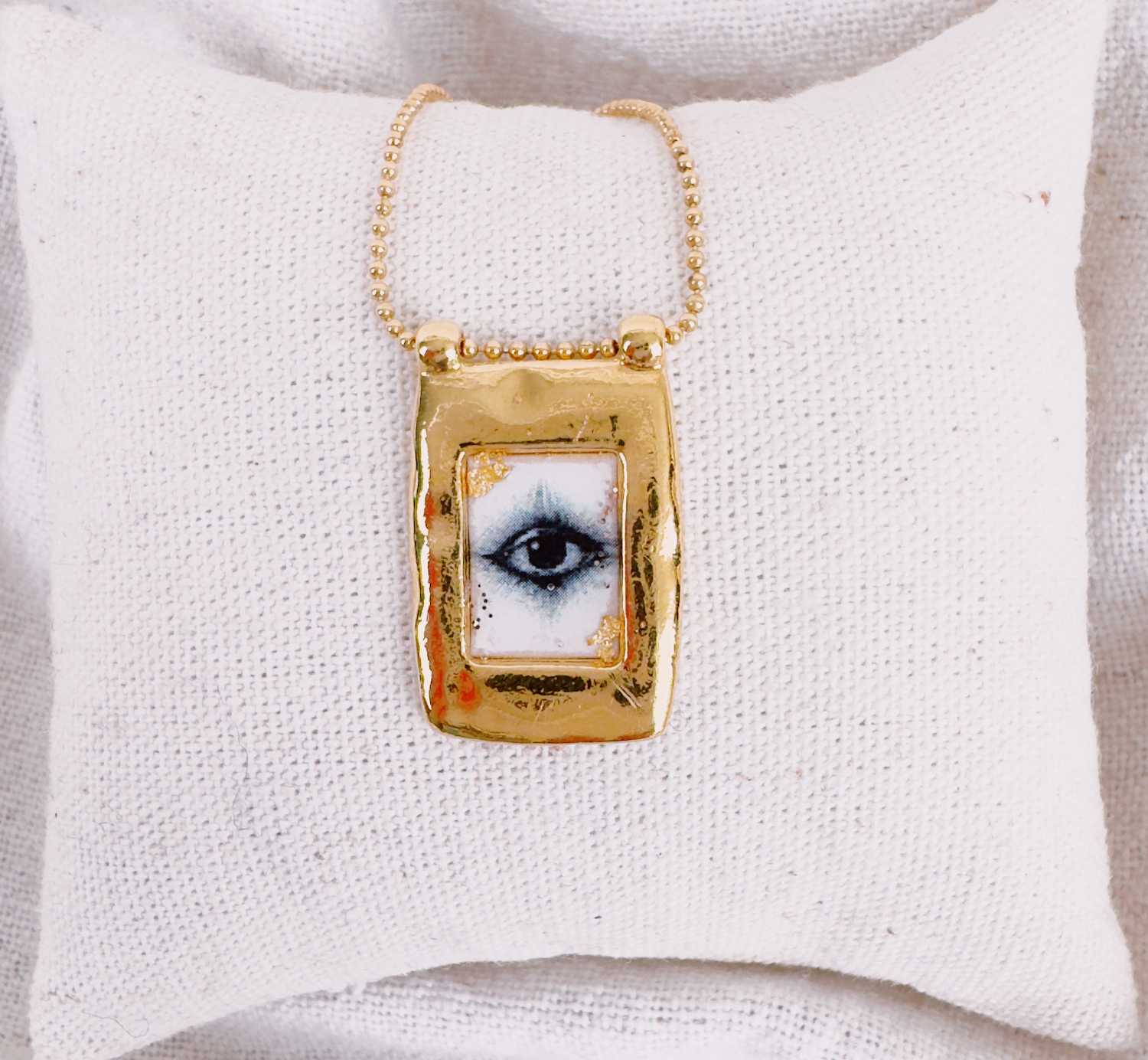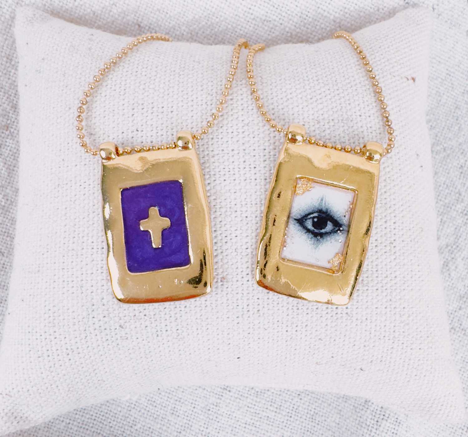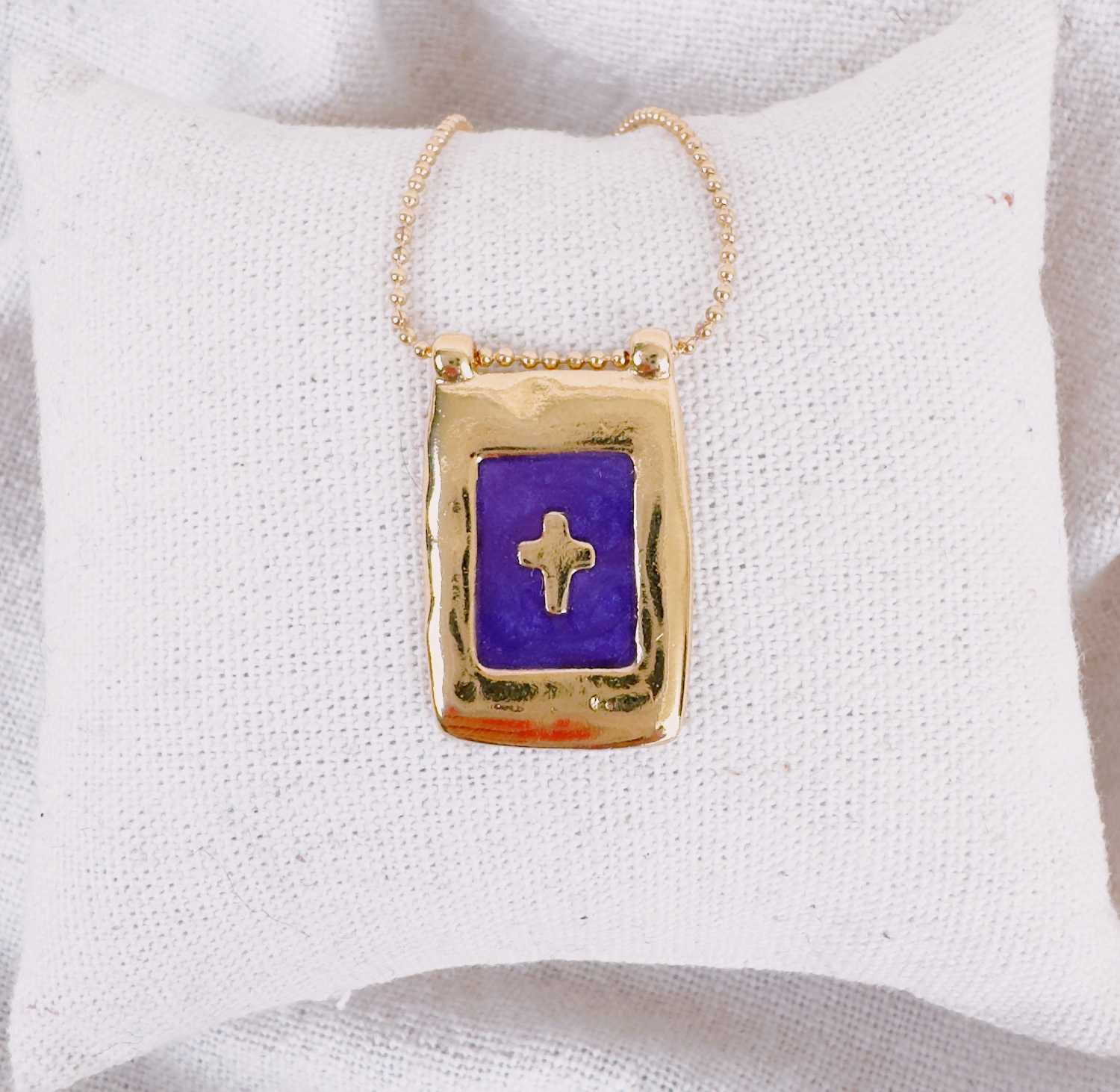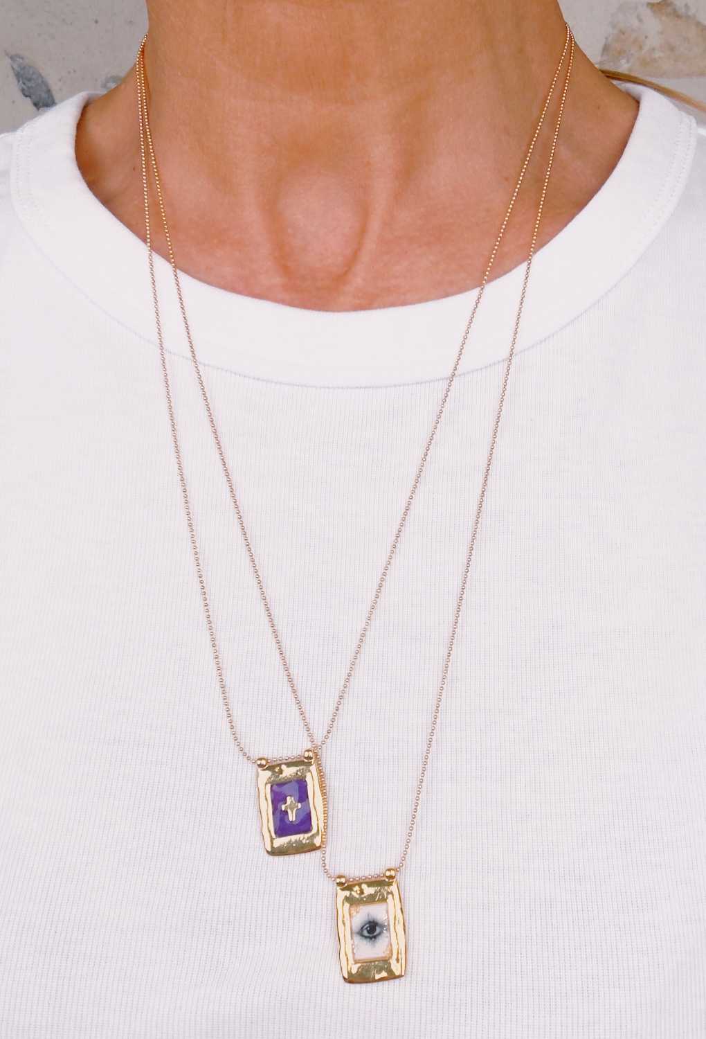 Collier sur chaîne billes fine et pendentif rectangulaire aux bords martelés renfermant une petite icône ou une petite croix entourée d’émail coloré.
