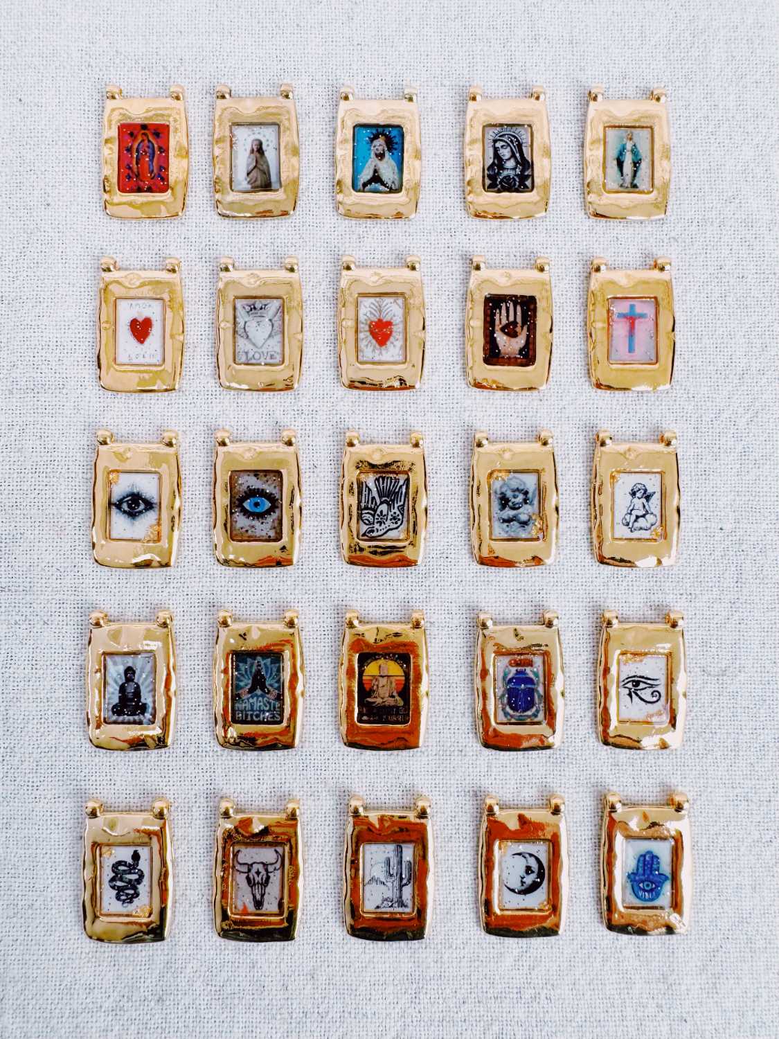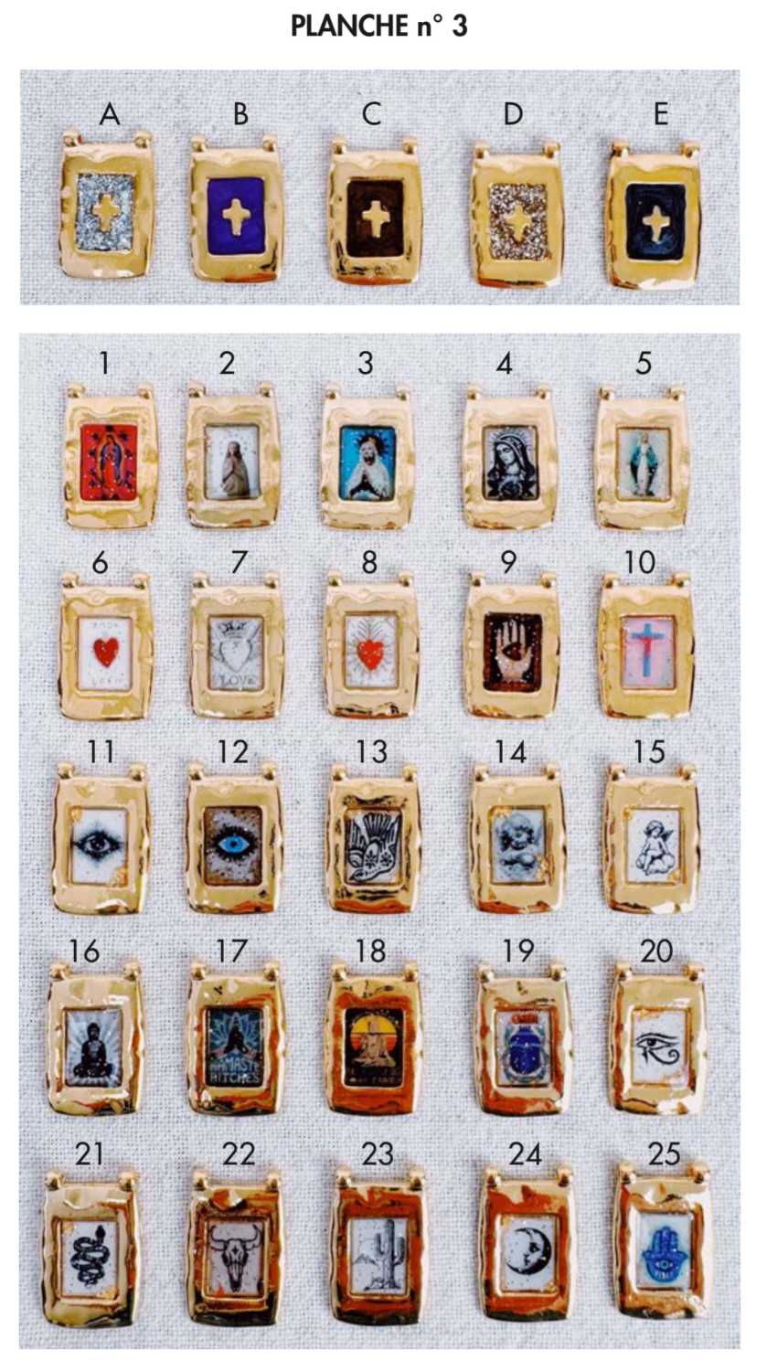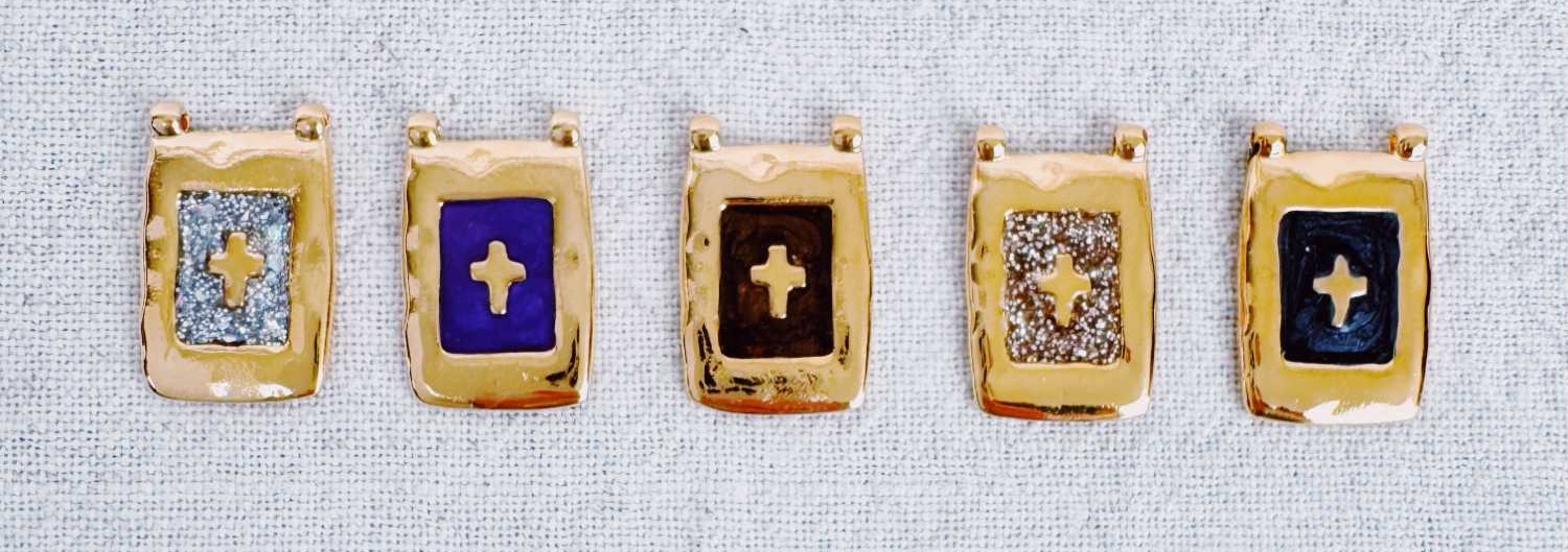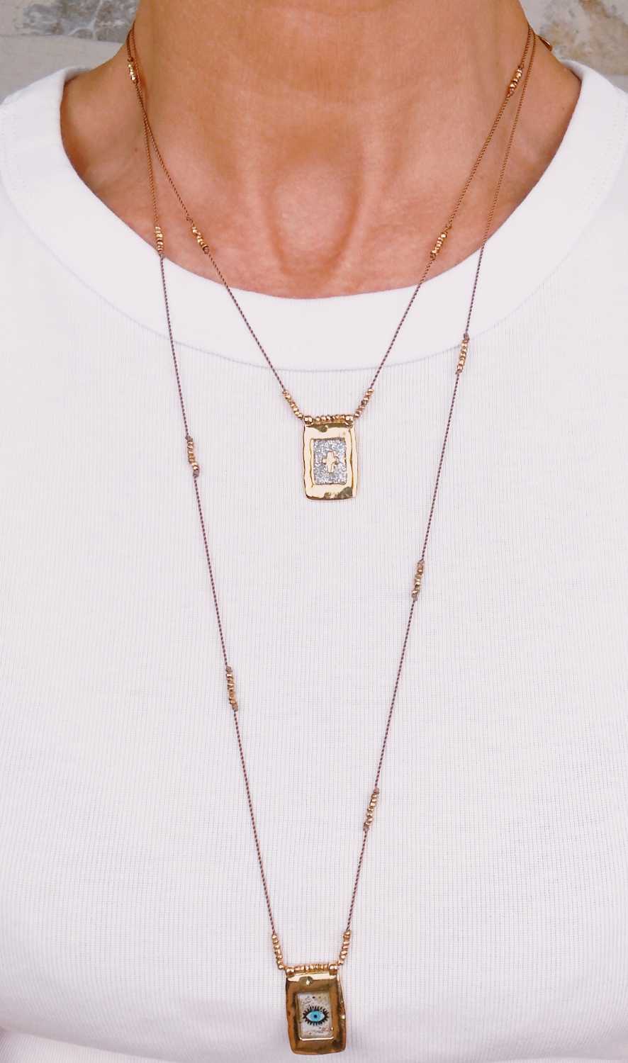 Collier sur cordon réglable parsemé de petites hématites dorées facettées avec un pendentif rectangulaire aux bords martelés renfermant soit un petit symbole soit une petite croix entourée d’émail coloré.
