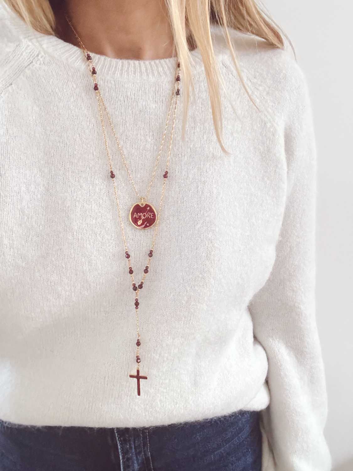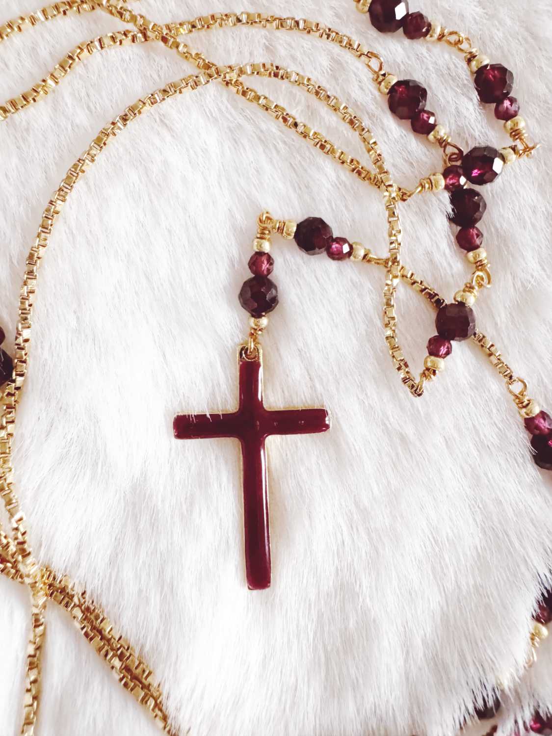 Chapelet en chaîne diamantée, pierres de tourmaline bordeaux et une croix émaillée bordeaux.