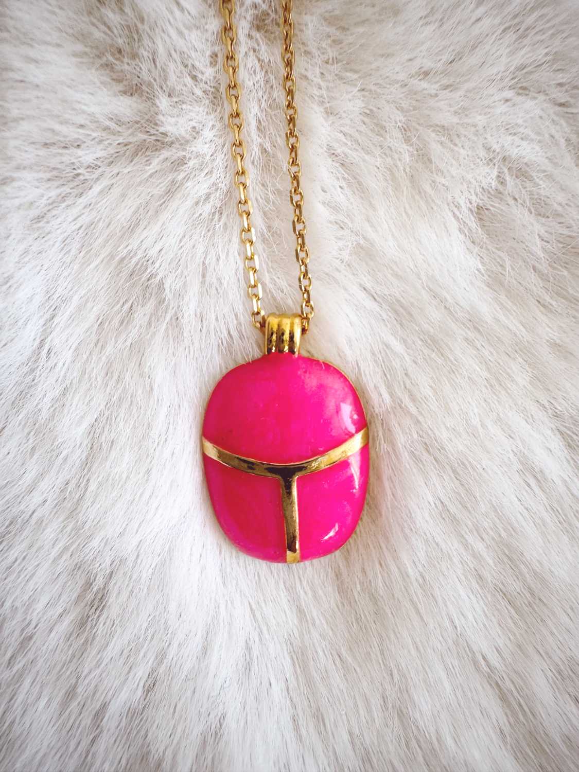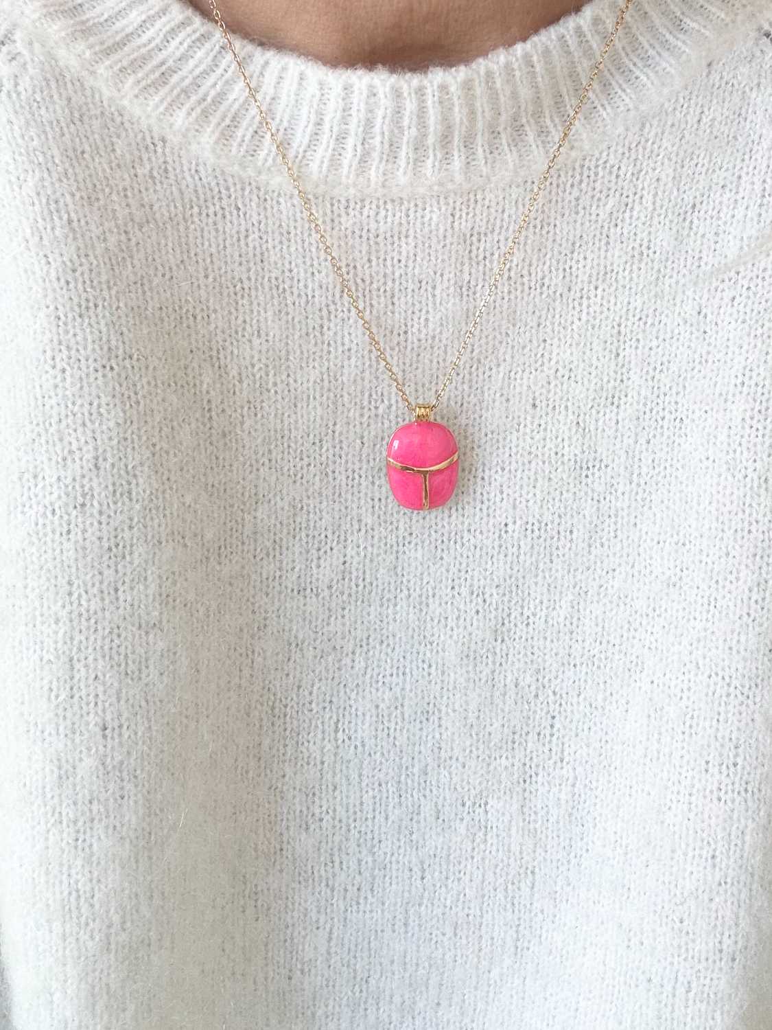 Collier sur chaîne fine et son pendentif scarabée petit modèle, émaillé de rose bubble. Longueur 38cm + 5cm de rallonge