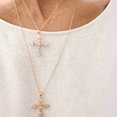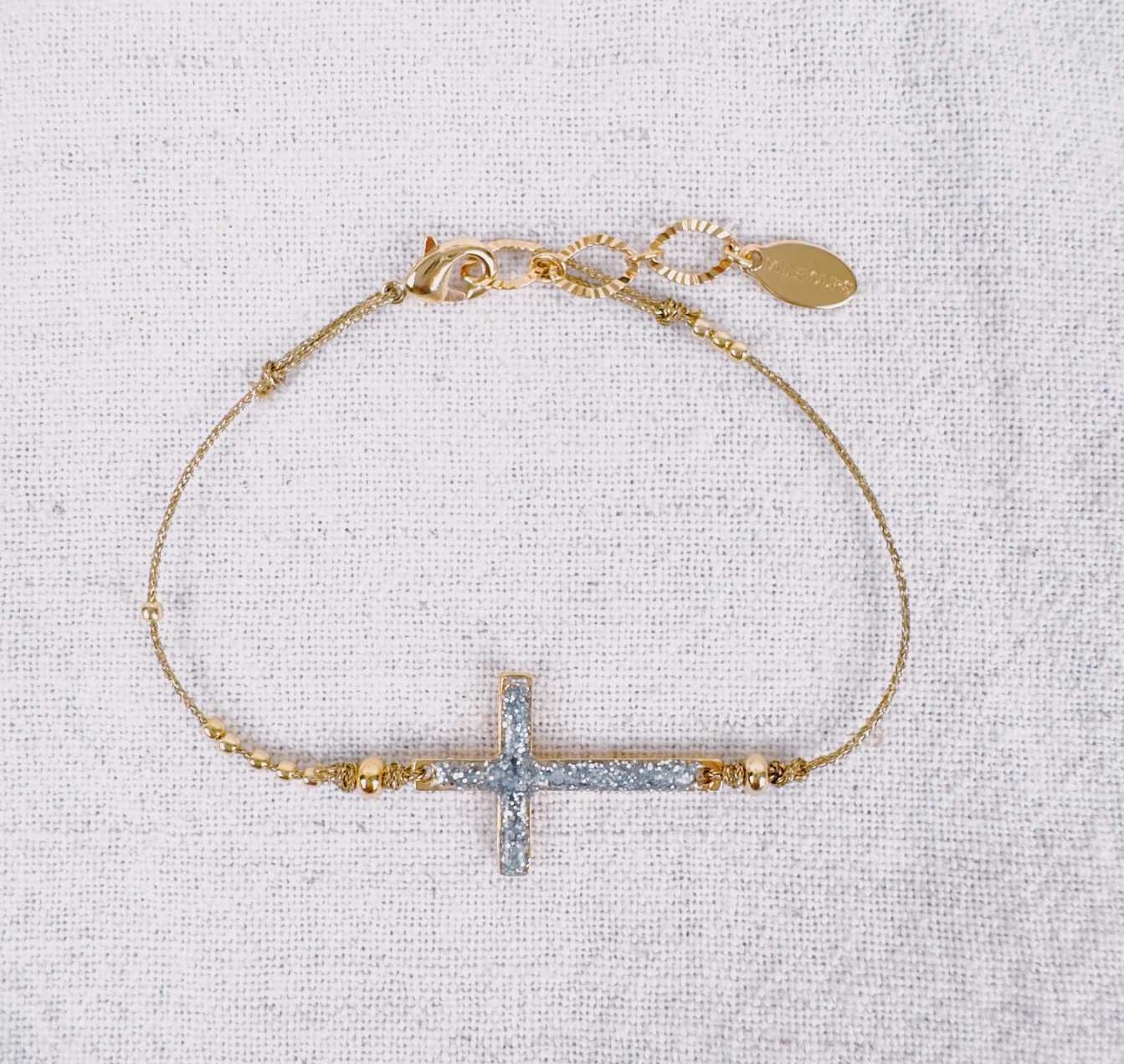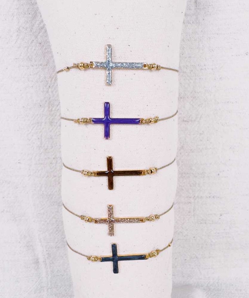 Bracelet en cordon lurex doré (fabriqué en région Rhône-Alpes) et composé d’une croix émaillée et de petites perles dorées. Adaptable à toutes les tailles de poignets par ses liens coulissants de chaque côtés.