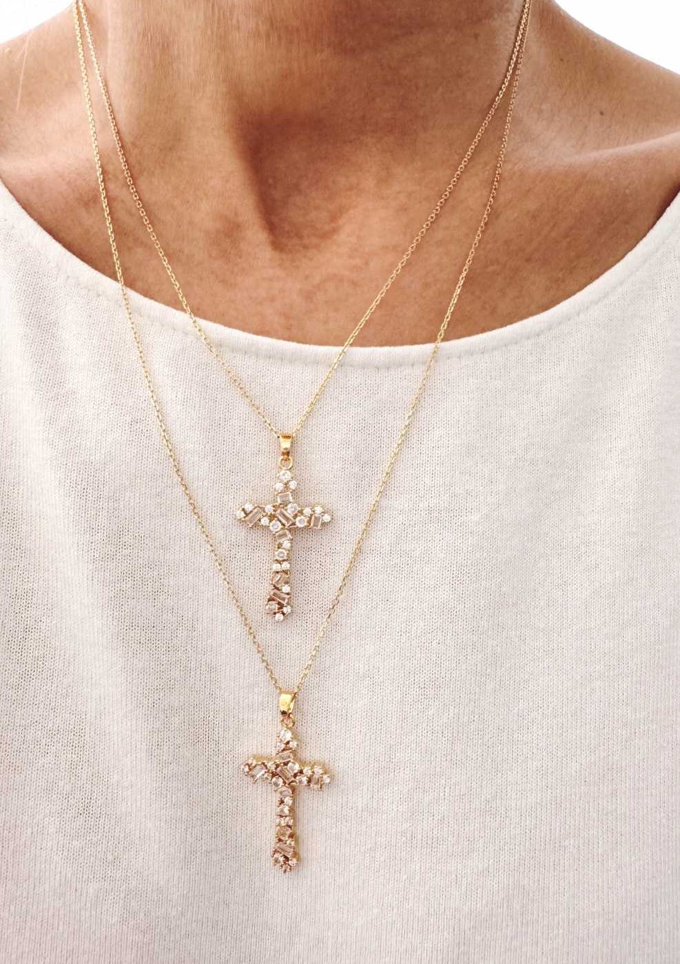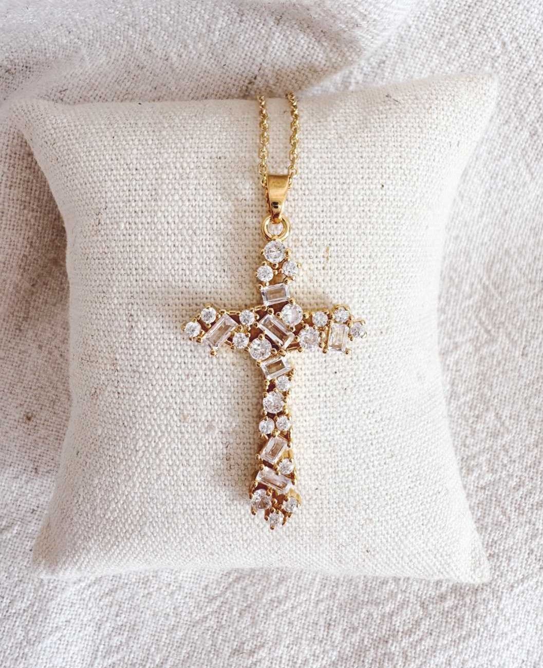 Collier chaîne fine et pendentif croix nommée Céleste en cristal transparent.
