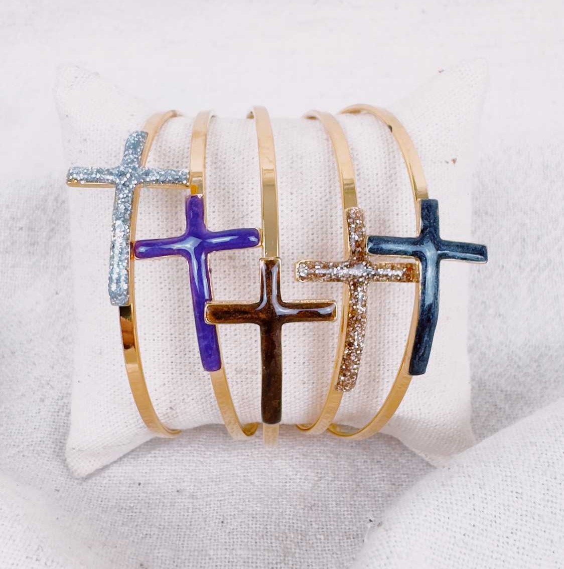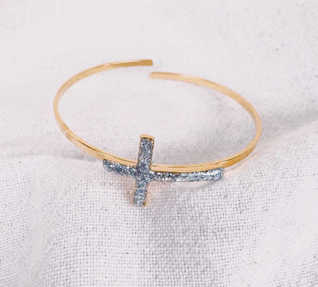 Jonc ouvert serti d’une croix horizontale émaillée.