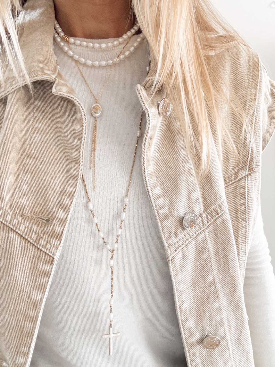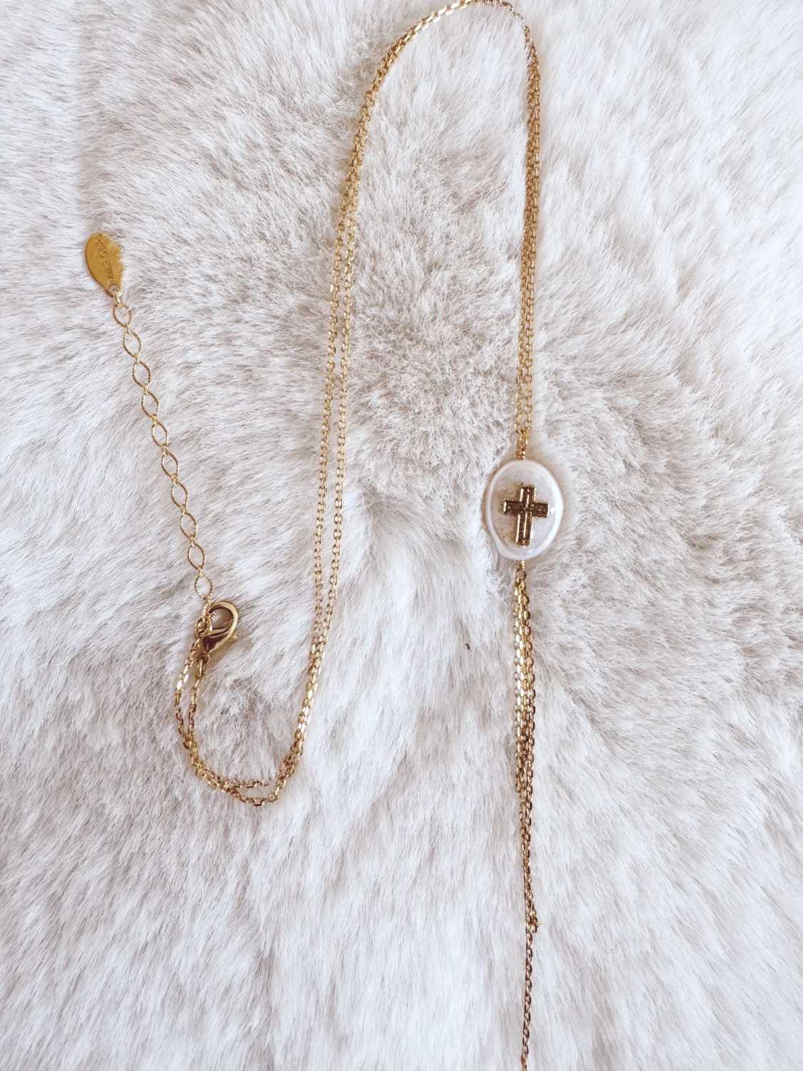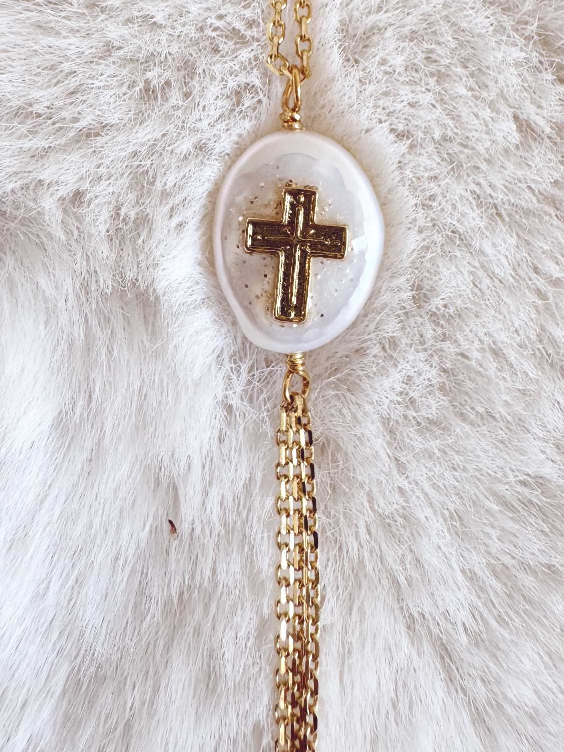 Collier sur chaine fine, composé d’un petit galet irrégulier sur lequel nous avons apposé une jolie croix entourée d’un émail translucide et pailleté. Le tout se termine trois chainettes formant un pompon fin et long.