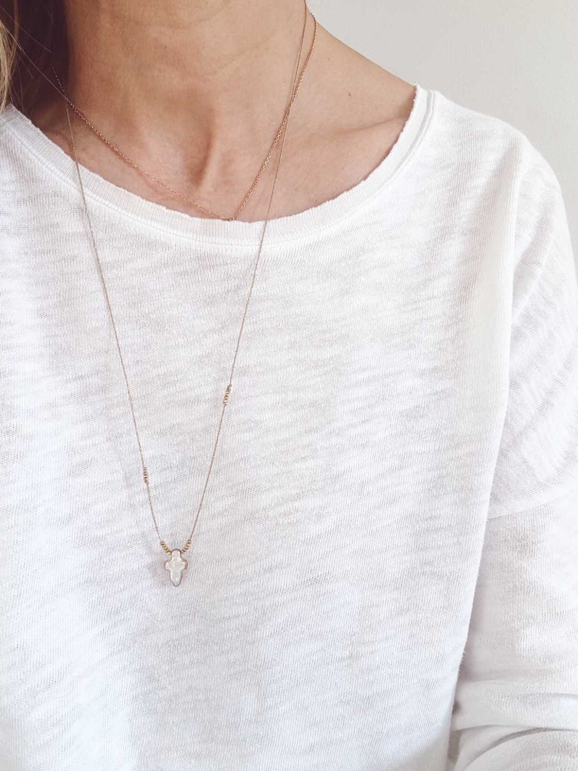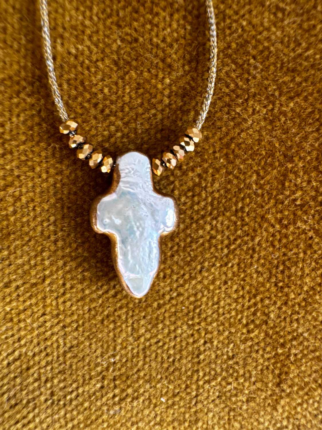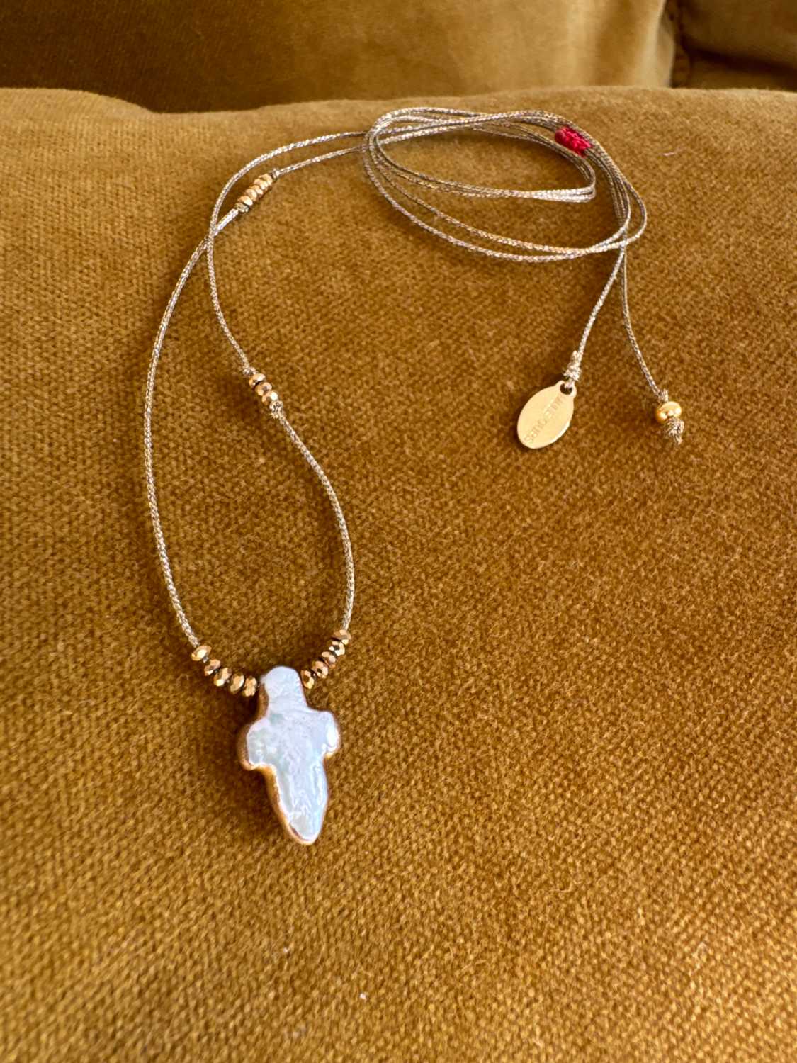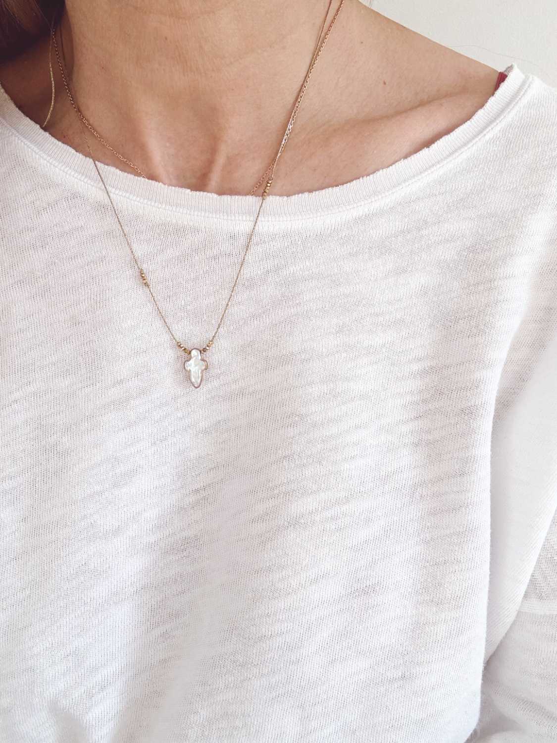 Collier ALBA sur cordon lurex doré et croix en nacre naturelle et lumineuse