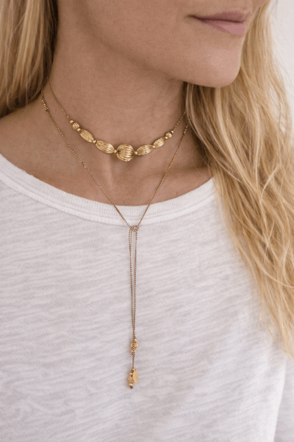 Collier écharpe sur cordon coloré, composé de différentes boules striées.